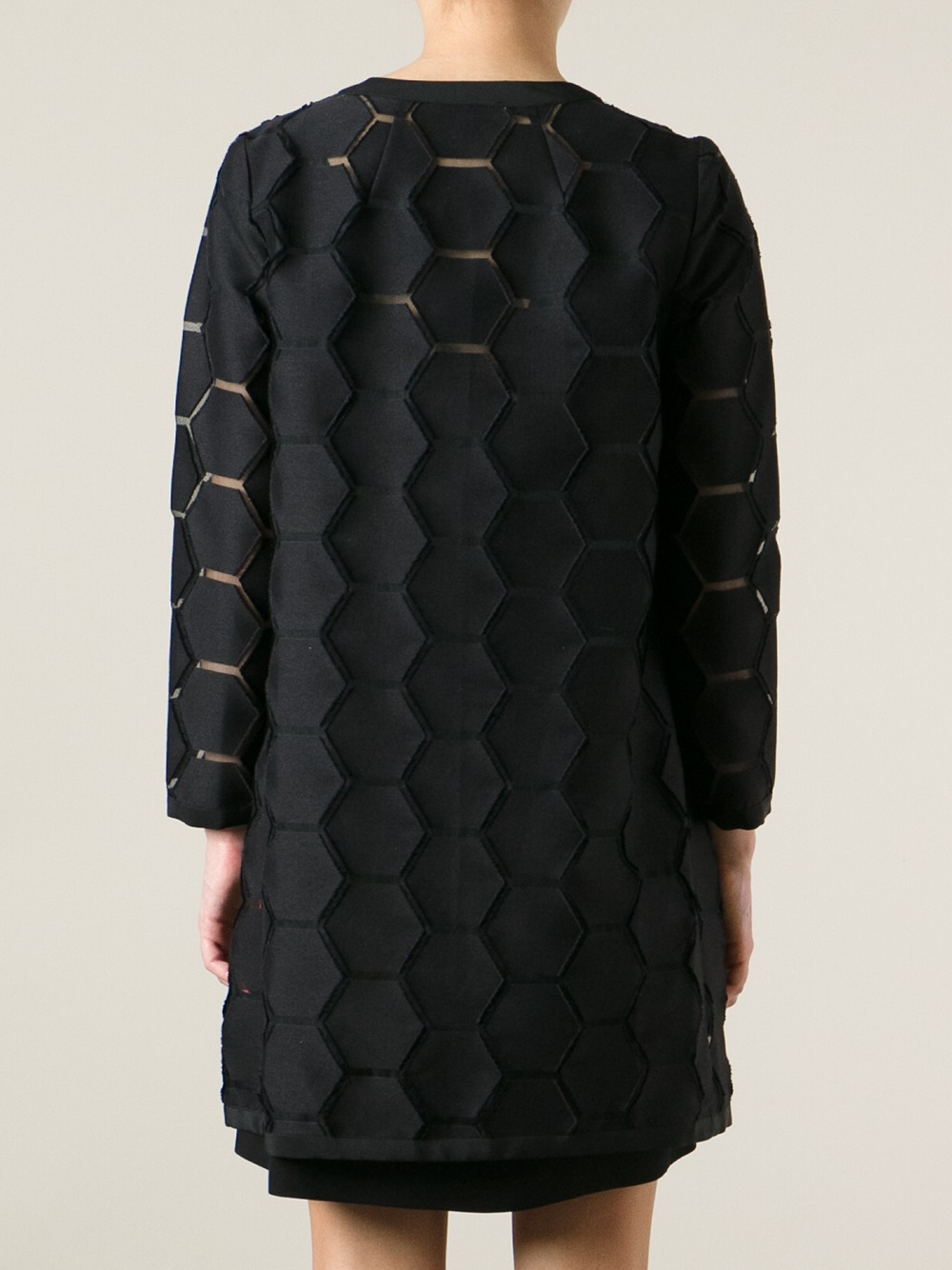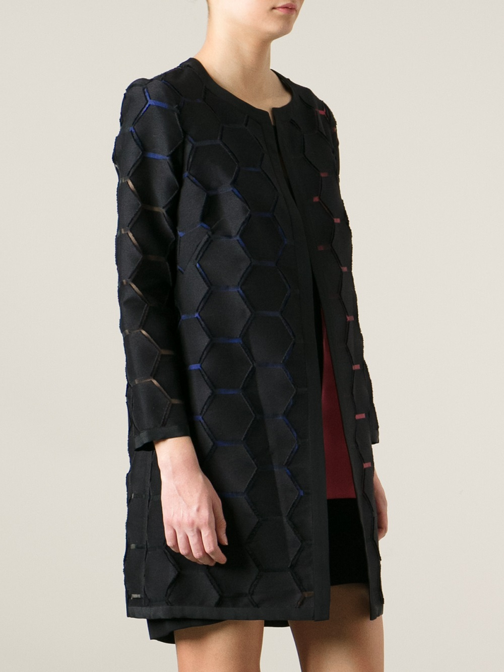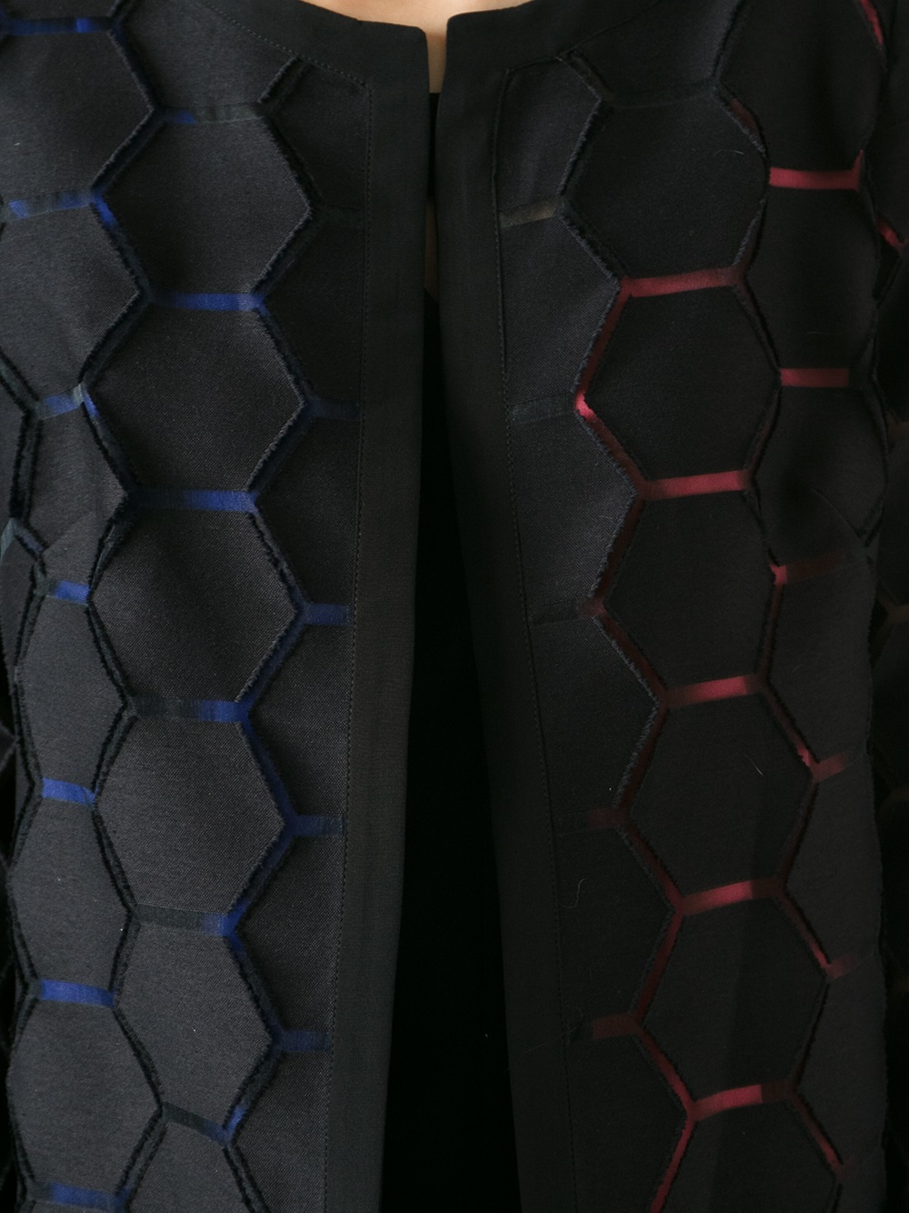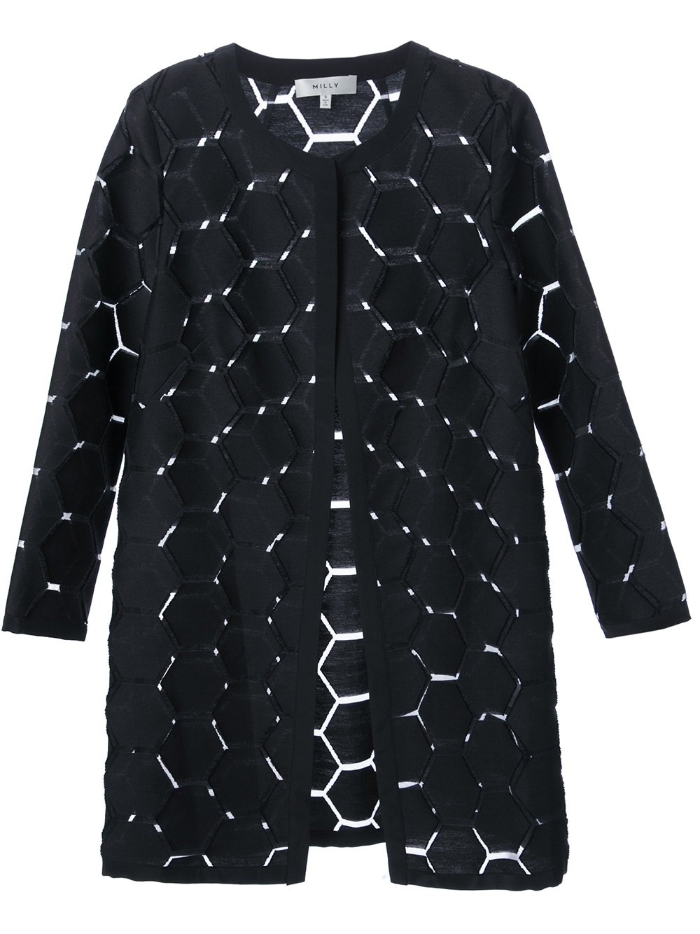 Black cotton blend hexagon panel jacket from milly featuring a round neck, an open front and long sleeves. Color: black