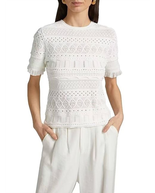 The short sleeve tee you'll want in every color.Elevate your spring closet with the Smocked Pointelle Top by MILLY, a chic addition in ecru perfect for engagement occasions. This women's tee features short sleeves with a delicate chiffon ruffle detail at the hem, crafted with a textured pointelle fabric that offers lots of stretch. The top is composed of 63% viscose and 37% nylon, providing a comfortable and breathable feel. Closure type is pull-on, and for care, simply hand wash and lay flat Color: white