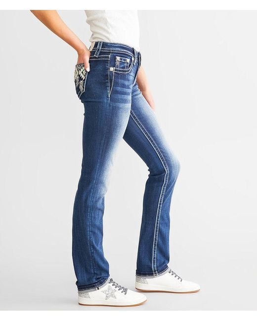 Low rise Cuffed - extend your inseam 1" when uncuffed Slim through the hip and thigh 13" bottom opening Rhinestones and sequins on embroidered back pockets Color: blue
