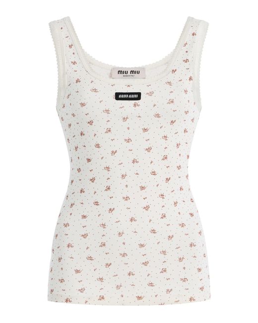 Miu Miu has served as Miuccia Prada's outlet to showcase her more playful side; without compromising elegance or style.The very fine ribbed knit jersey of this tank top recalls a preppy aesthetic and is enriched by a refined floral motif and discreet embroidery; ideal for the playful layered looks typical of Miu Miu style. Color: white