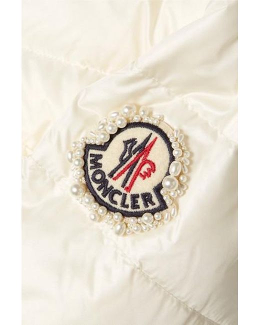 Simone Rocha's second collaboration with Moncler Genius focuses on the theme of gardening. Think lightweight spring outerwear with ruffles inspired by flower petals. Made from glossy cream shell, this quilted jacket is filled with fluffy down to protect against early morning chills and embellished with lustrous faux pearls encircling the logo patch at the sleeve. Attach the removable hood on particularly cold days. Color: natural