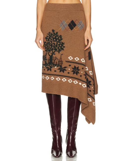 Monse Mixed Fair Isle Midi Skirt in Brown 100% wool. Made in China. Dry clean. Unlined. Elastic waistband. Knit textile. MNSF-WQ33. MF250120VIC. About the designer: Inspired by confident, fearless women, Monse is a fresh take on modern femininity. Balanced by vibrant color palettes, exquisite fabrics and discreet finishes, the label expresses its effortless aesthetic through structural yet breezy silhouettes.
