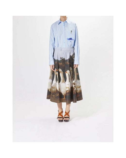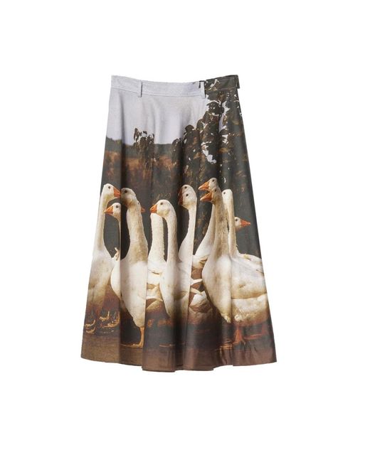 Elevate your style with this Moschino midi skirt. Crafted from 100% cotton, this multicolored skirt features a unique goose print, side pockets, belt loops, and a side zip closure. Made in Italy. Color: gray