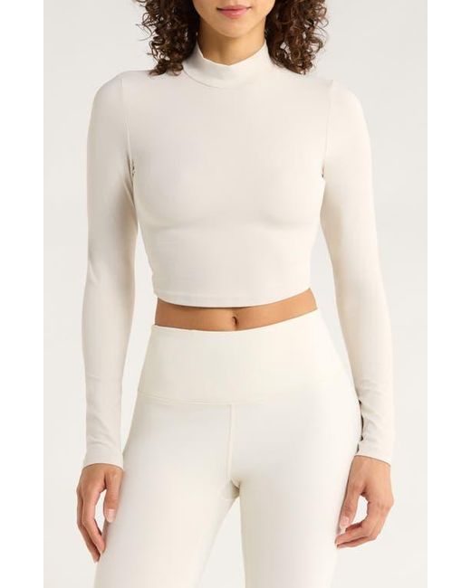 A twisty open back keeps you feeling breezy as you move in this moisture-wicking crop top made of softly peached jersey. Color: white