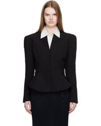 Go to AntonioliNavywool twillstand collarv-neckpadded shouldersconcealed press stud closurecinched waistpeplum hemfitted Color: blue