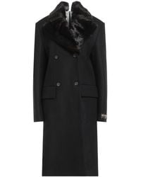 Go to YOOXN°21. single-breasted coat, twill, plain color with appliqués, brand logo, plush fabric trims, classic collar, long sleeves, partially lined, snap fastenings, welt pockets, dry clean, do not bleach, do not tumble dry. 82%