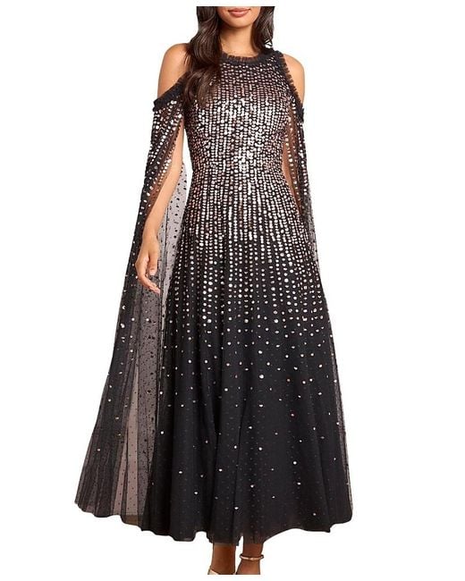 Women's Black Moonlight Sequin Cape Sleeve Ankle Gown