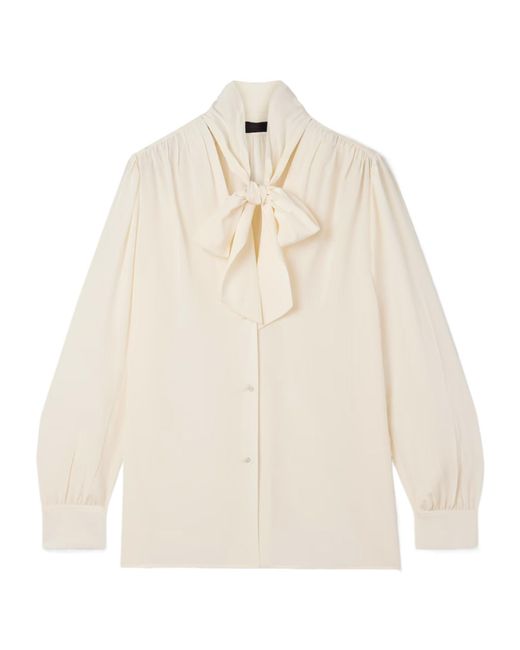 Made from lightweight silk crepe fabric, it drapes beautifully and fits the body perfectly. It features an adjustable bow tie and glossy buttons. Color: natural