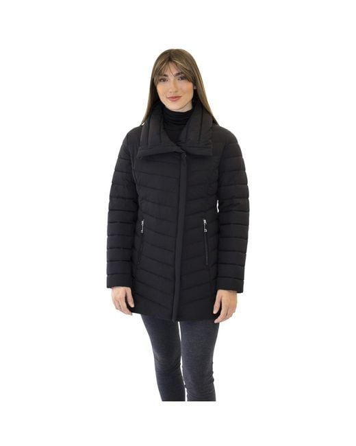Modern Short Puffer with Versatile Styling – This Nine West women's coat is designed in a 29-inch length, delivering a polished silhouette that provides warmth without bulk. Its shorter cut pairs easily with jeans, leggings, or pants, making it a go-to outerwear piece for both weekdays and weekends. High Stand Collar for Extra Warmth – The structured stand-up collar offers both style and protection, creating a sleek, modern look while keeping your neck shielded from cold air. Worn fully closed or slightly open, it provides versatile wear and added comfort in chilly weather. Chevron Quilting for Flattering Shape – Designed with slimming angled quilt lines in front and back, this puffer creates a flattering fit while ensuring even insulation. The quilting detail enhances structure, giving the coat a refined finish that balances fashion and practicality. Hidden Snap Placket & Secure Pockets – A smooth front zipper reinforced with a snap placket keeps warmth in and delivers a tailored, polished look. Two sleek zippered pockets provide secure storage for essentials, blending seamlessly into the coat's streamlined design. Available in Black and Taupe by Nine West – Offered in two versatile neutrals, this Nine West puffer coat complements any closet. Classic black adds sophisticated edge, while soft taupe delivers a lighter neutral that is equally chic and easy to style. Color: black