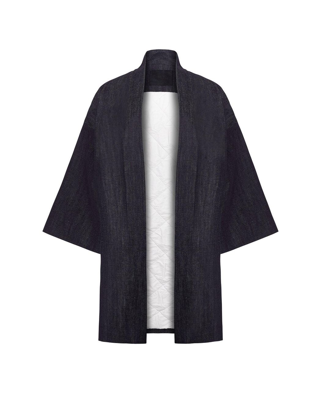 Silvia Dark Denim Niran jacket, crafted with classic traditional tailoring that speaks to your refined sense of style. Embracing a relaxed and comfortable yet undeniably chic fit, this jacket embodies the essence of luxury with our signature dark denim sourced from Japan, perfectly complemented by the allure of our signature padded white fabric from Turkey. Its open front, practical pockets, and graceful long sleeves make it the ultimate choice to elevate any outfit, adding a touch of sophistication to your ensemble. Embrace the warmth and elegance of the Niran jacket during the cooler fall and colder winter months, as it gracefully envelops you in comfort and style. Belt Included, One Size Made in New York City Dry Clean Only 100% Cotton Color: blue