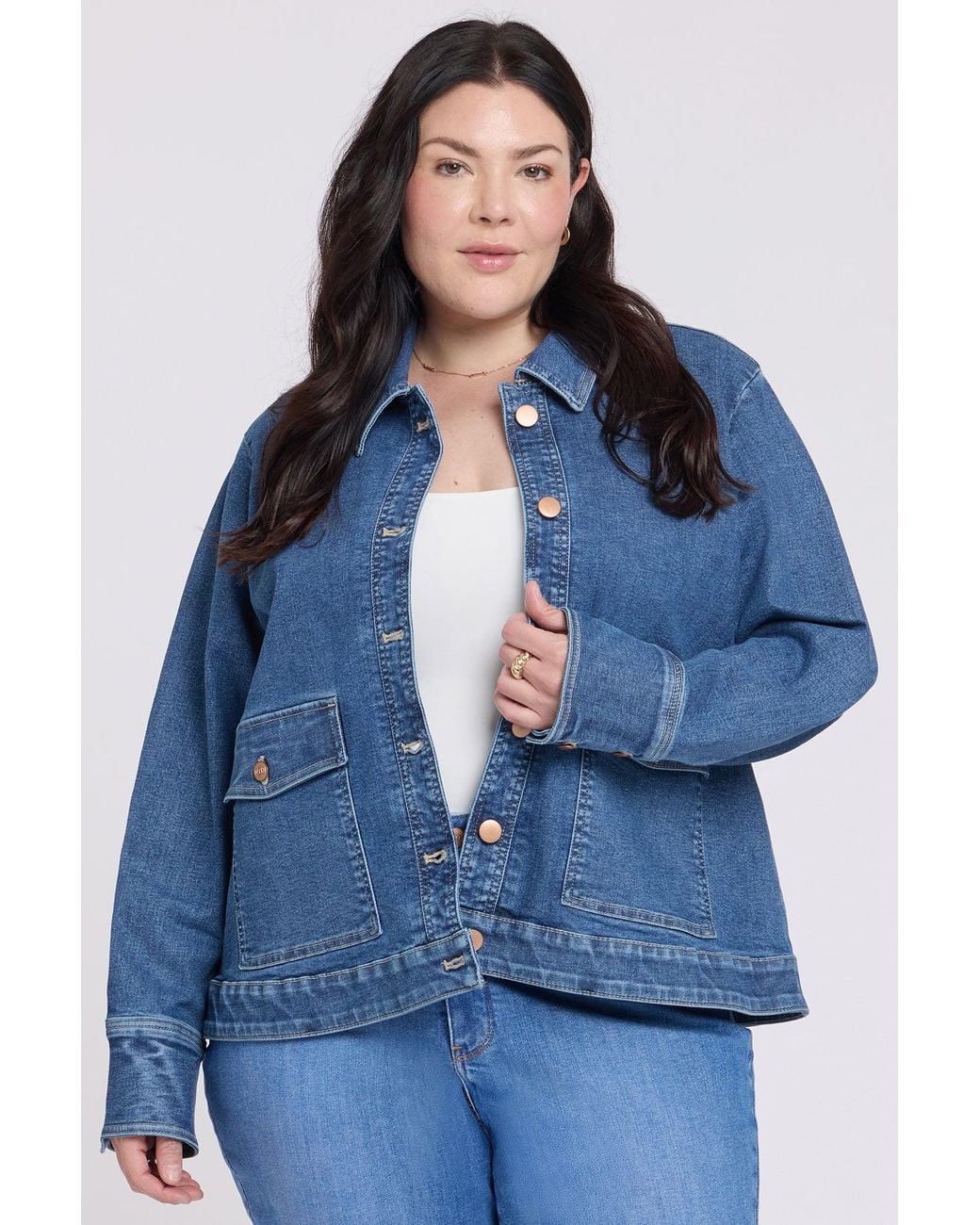 Layer on modern utility style with NYDJ's Denim Jacket in Plus Size with Oversize Pockets. Created from premium denim, this versatile casual jacket features a point collar and bold button-flap pockets in the front. Finished with front button closures and button cuffs. Salton is a medium-dark indigo wash with subtle texture that gives it a worn-in look and feel. This jacket is made with earth-friendly methods that result in reduced consumption of water, chemicals and/or energy. Color: blue