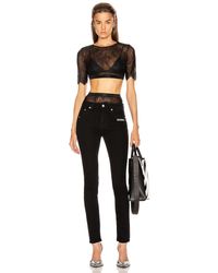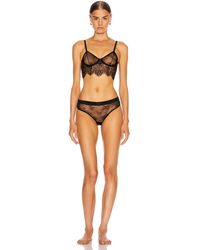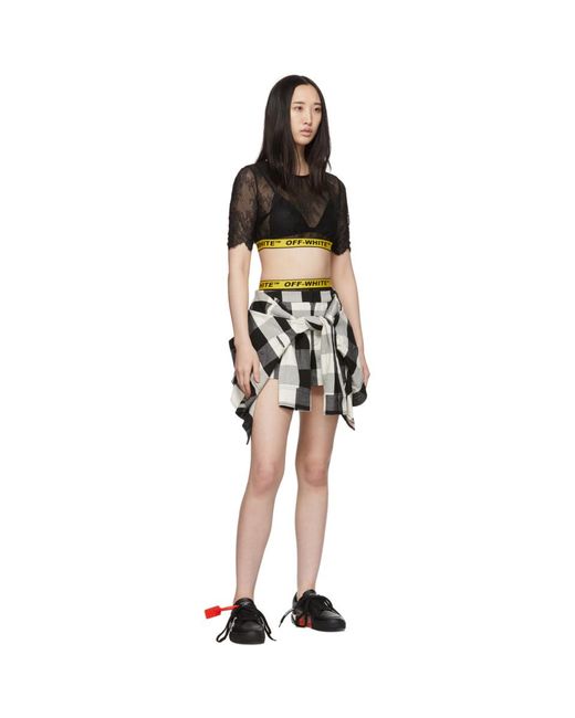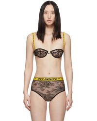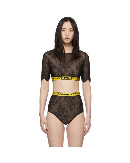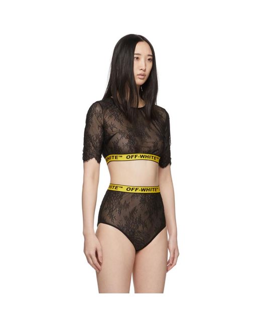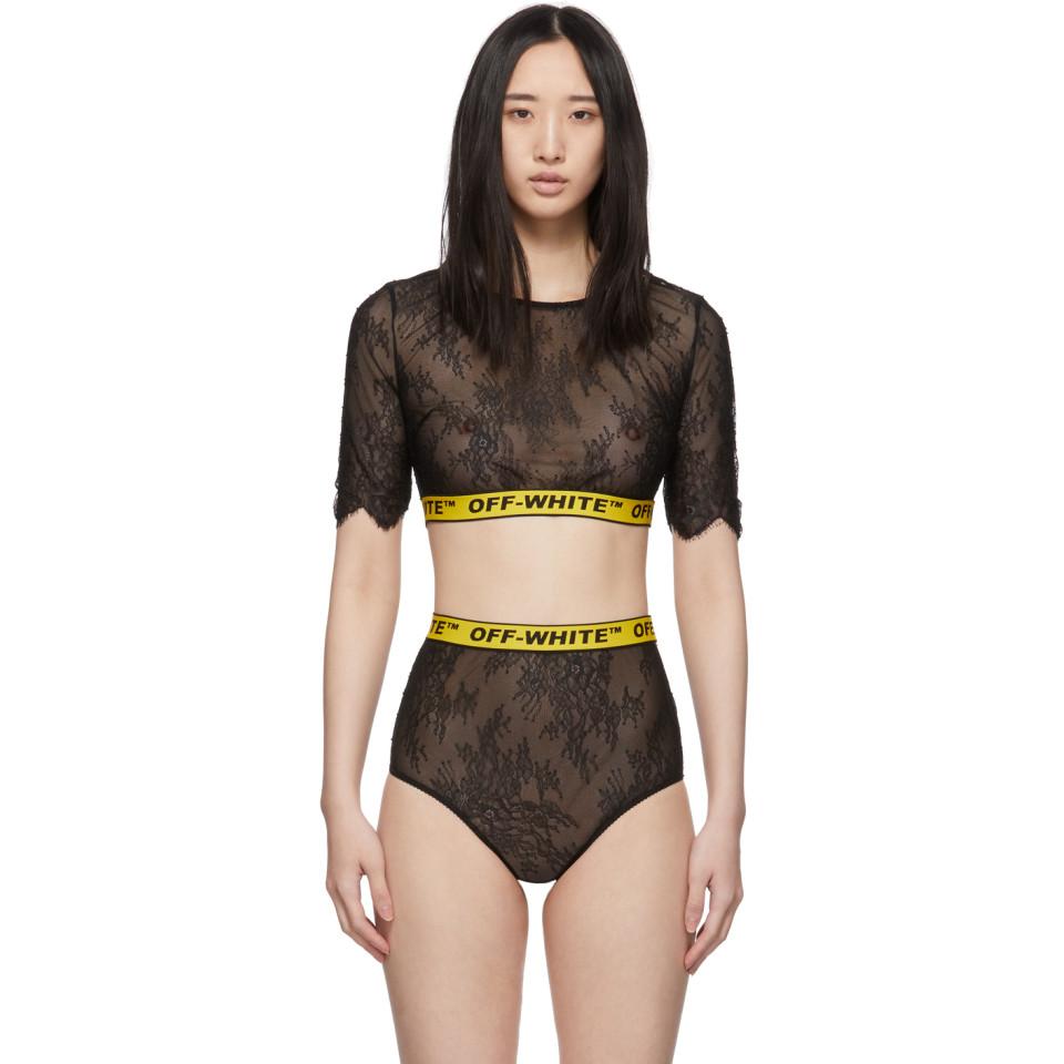 Half sleeve semi-sheer nylon lace t-shirt in black. Crewneck collar. Elasticized logo-patterned trim in yellow and black at hem. Scalloped edge at cuffs. Semi-sheer nylon lace briefs in black. High-rise. Elasticized logo-patterned waistband in yellow and black. Partially lined. Color: black