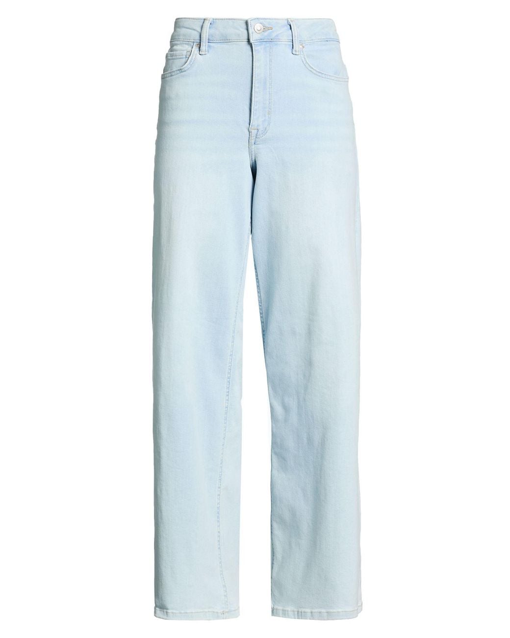 Wide-leg jeans, denim, faded, stretchy fabric, solid color, no appliqués, light wash, high waisted, belt loops, relaxed fit, button fastenings, zipper fastening, five pockets, machine wash or dry clean, do not bleach, do not tumble dry , Color: Blue , Size: M-32L