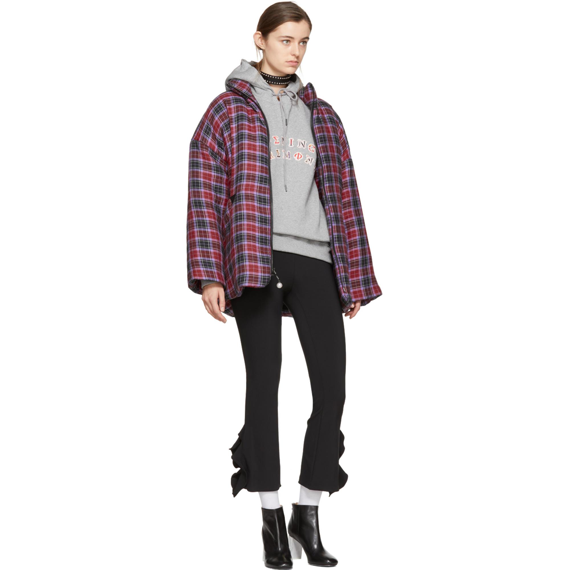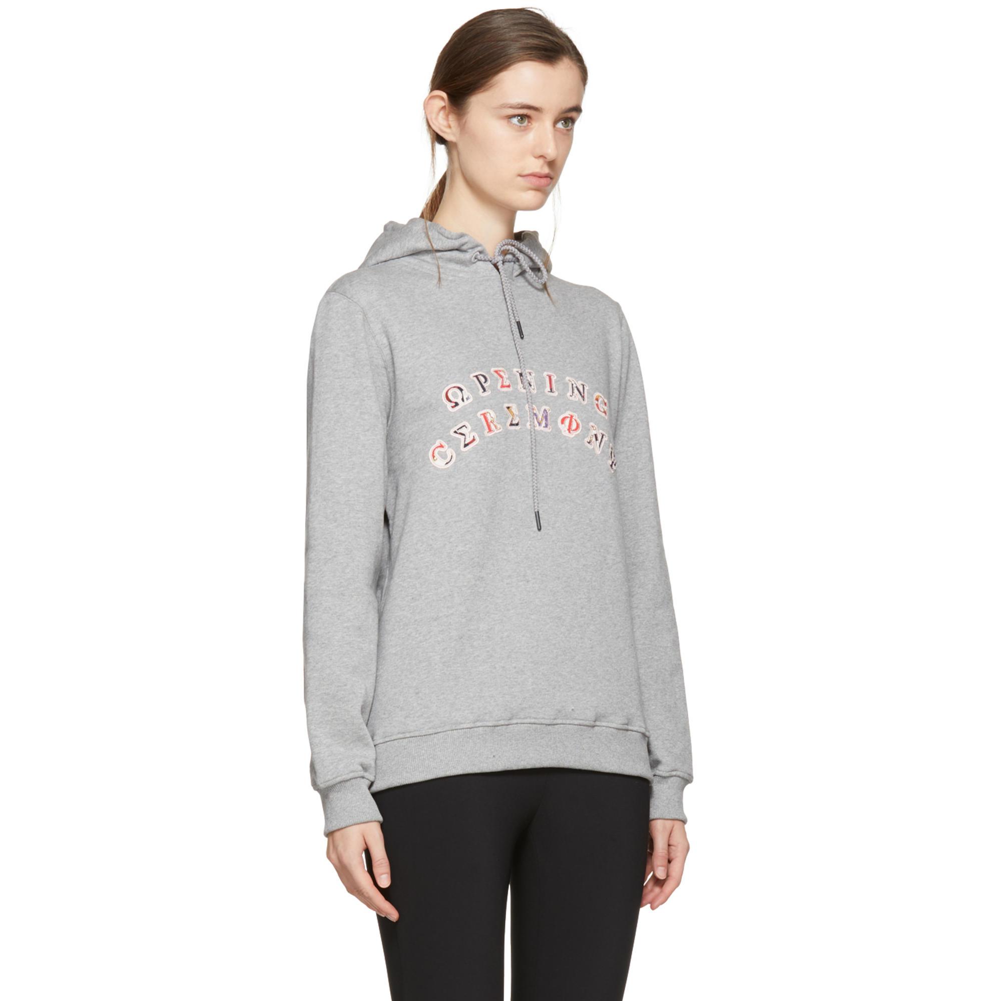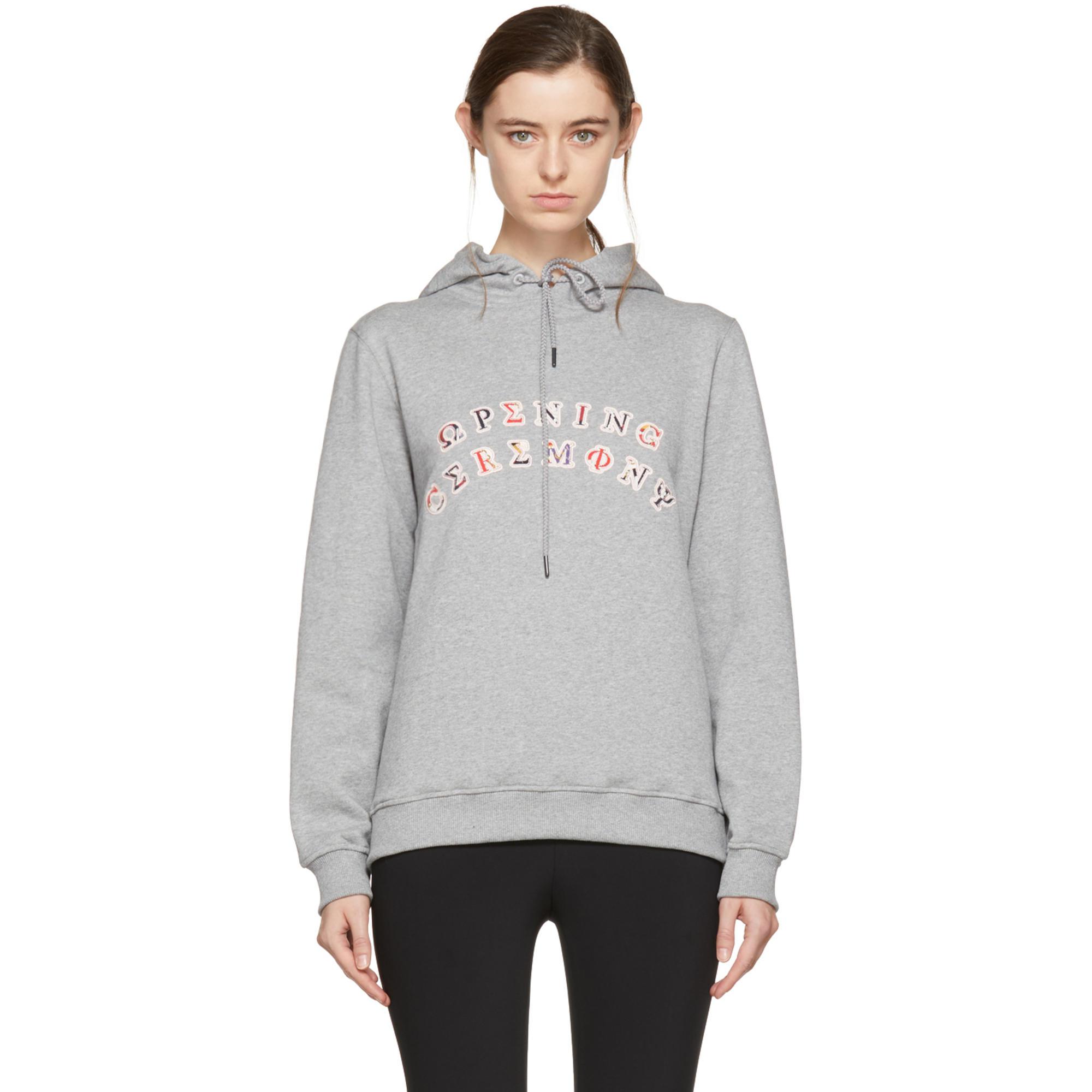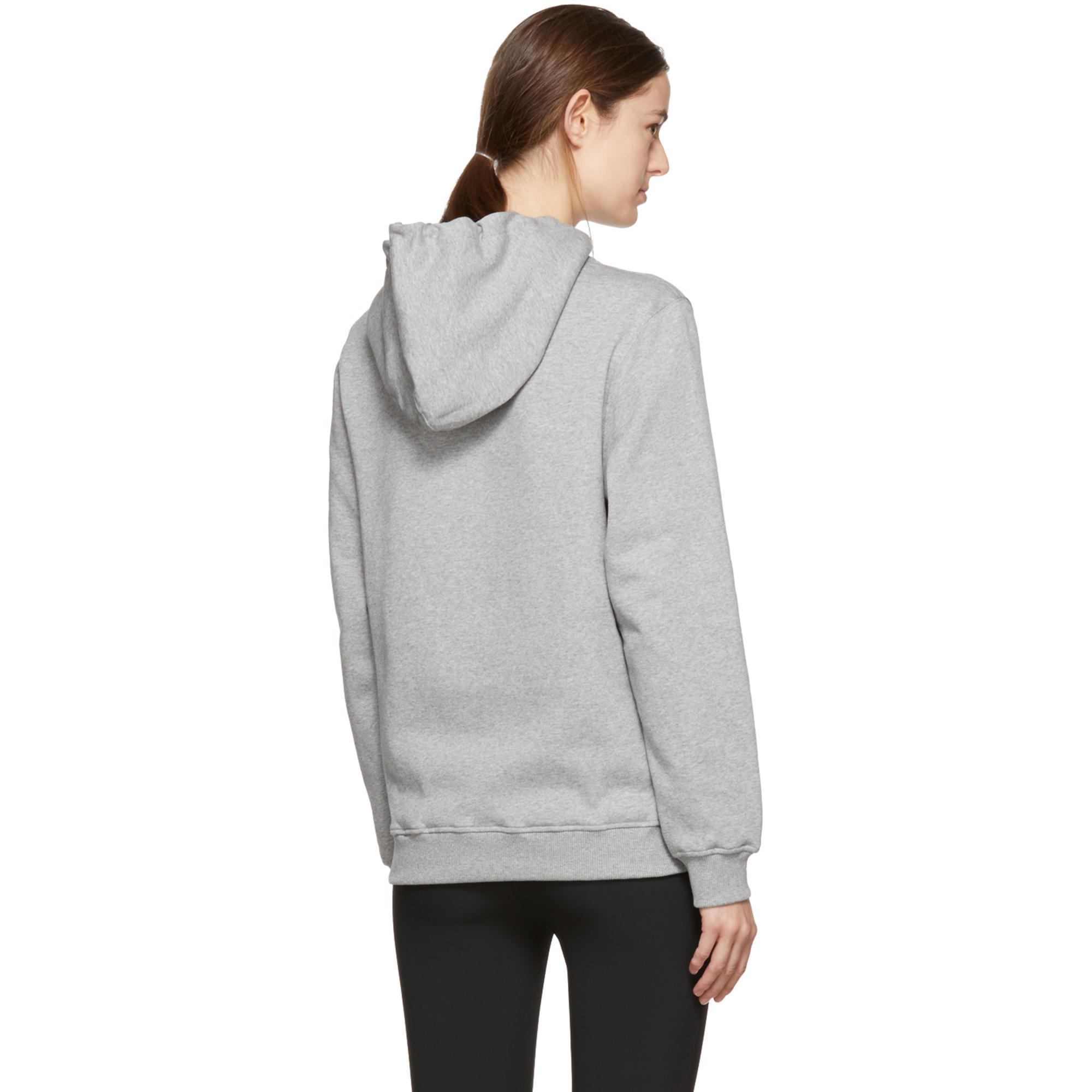 Long sleeve cotton fleece hoodie in heather gray. Drawstring at hood. Multicolor logo embroidered at front. Dropped shoulders. Rib knit cuffs and hem. Tonal stitching. Color: gray