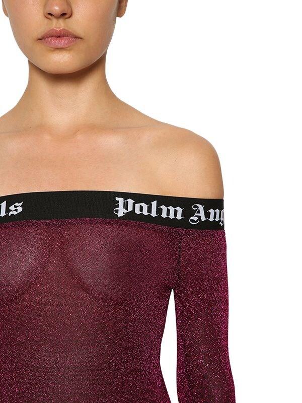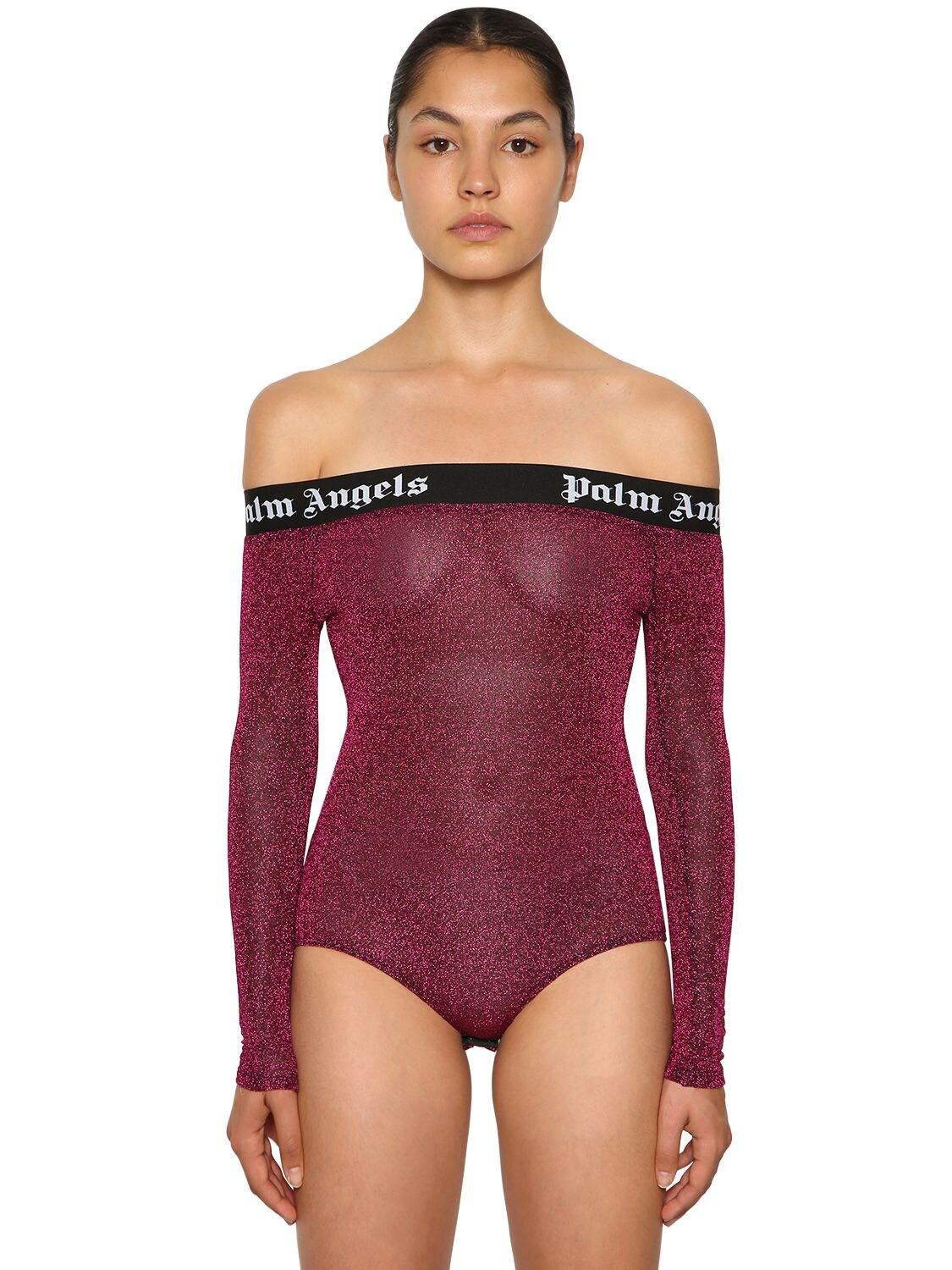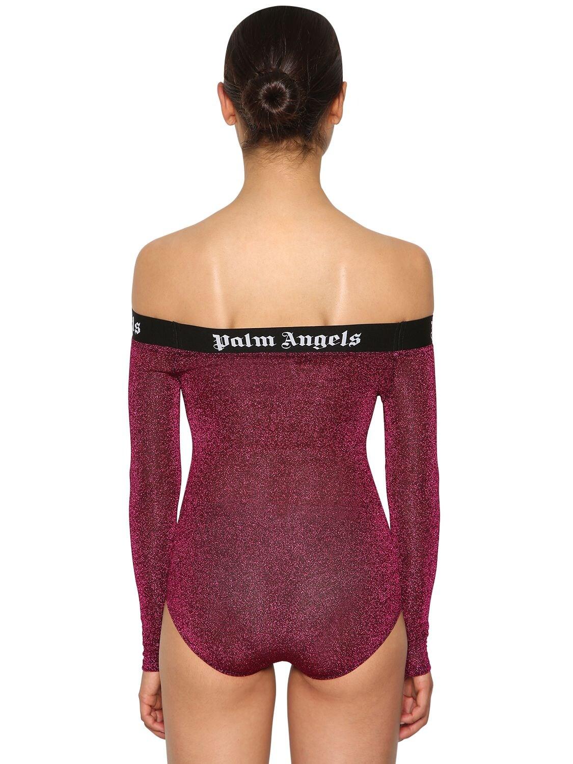 Palm Angels Women's Purple Logo Band Off The Shoulder Bodysuit