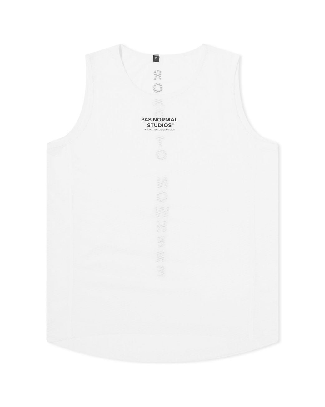 Hop on the saddle wearing performance gear you can trust with the Pas Normal Studios Sleeveless Base Layer. Incredibly lightweight, it looks and feels invisible under your jersey and moulds to your body’s movement like a second skin. The mesh structure disperses moisture to keep you dry, regulating temperature with a natural cooling mechanism by promoting the evaporation of sweat. It’s a trusty foundation for those looking to push their performance and feel the ride on the never-ending “road to nowhere”. 94% Polyester, 6% Elastane, Lightweight Mesh Fabric, Disperses Moisture, Anatomically Fitted, Printed Branding, Style Code: MA0940H-100, Shop All Men's Pas Normal Studios Tops, Shop All Men's Tops. Pas Normal Studios Men's Sleeveless Base Layer in White, Size Small | END. Clothing Color: white