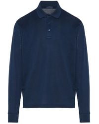 Go to FARFETCHNavy blue striped embroidered detail long sleeves polo collar button fastening Size: S. Gender: Male. Material:Cotton. Color: blue