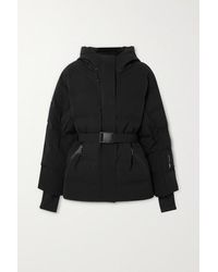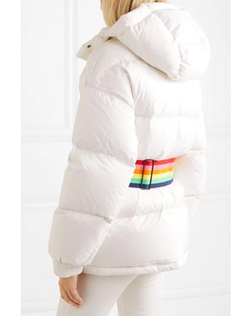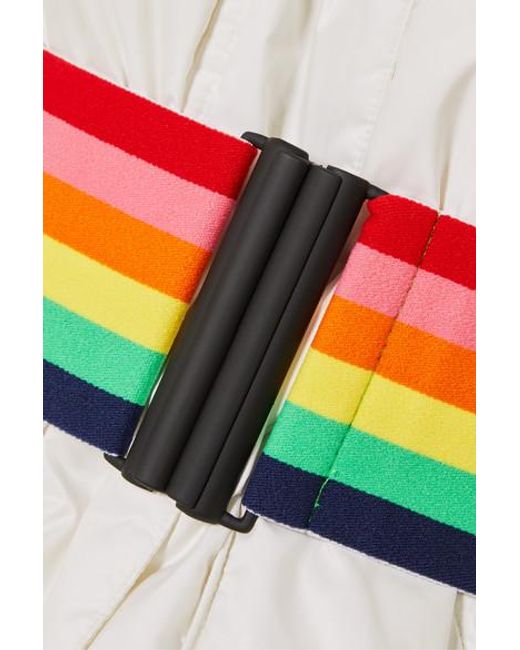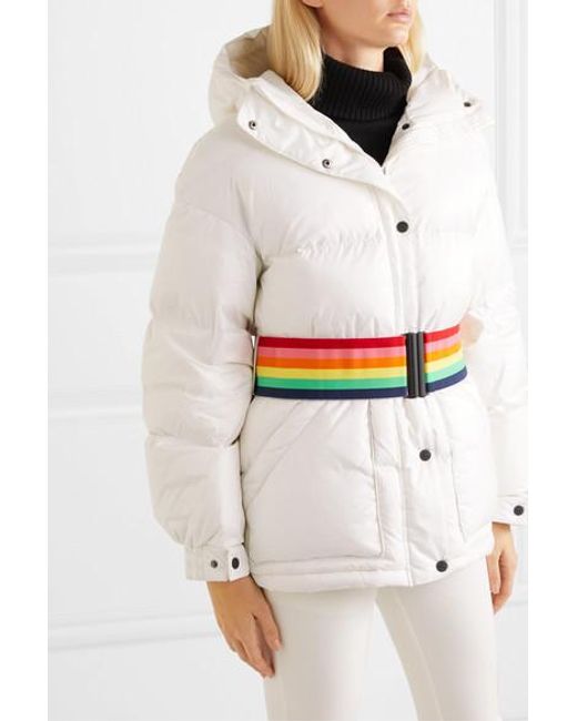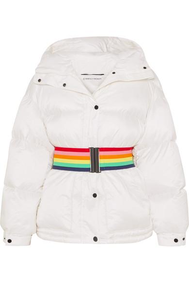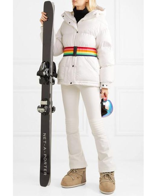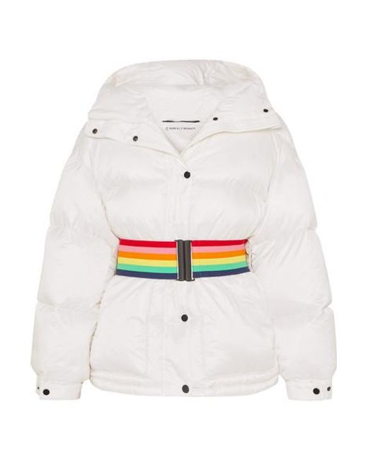 The unique tech fabrics in our ski collection offer the very best protection and insulation for days spent cruising the piste, says Perfect Moment. Inspired by retro styles, this jacket is cut from the brand's high-tech Dermizax® shell that's both breathable and waterproof, and padded with goose down and feathers for insulation. It's fitted with a cozy hood and has interior pockets for your ski goggles and earphones. Use the coordinating tie belt or the elasticated rainbow version to cinch the loose shape. Color: white