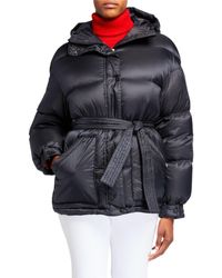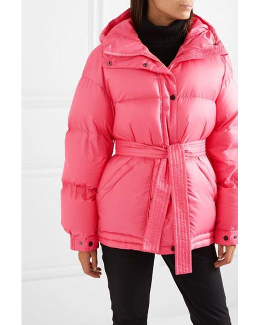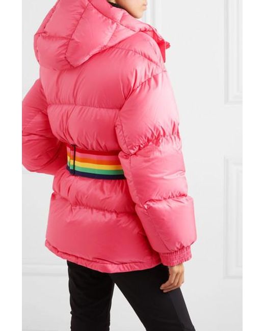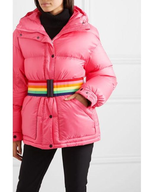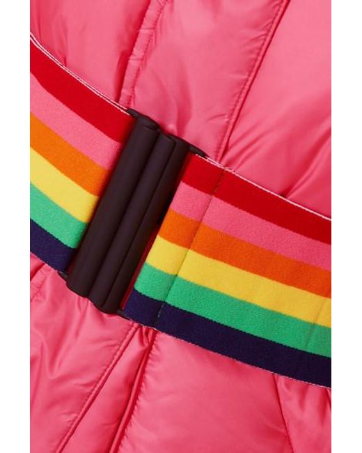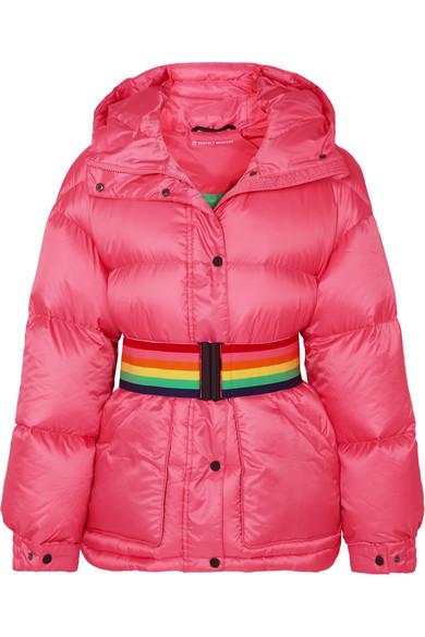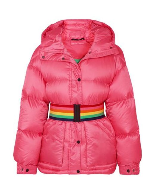 Fabric: Technical weave. Contrast lining. Additional rainbow belt included. Mid-length profile. Hooded style. Long sleeves. Hidden zip at placket. Snap at placket. Self-belt at waist. Patch front pockets. Lined. Shell: 100% polyester. Lining: 100% polyester. Fill: 90% goose down/10% feather. Wash cold. Style #PMOME30072. Color: pink