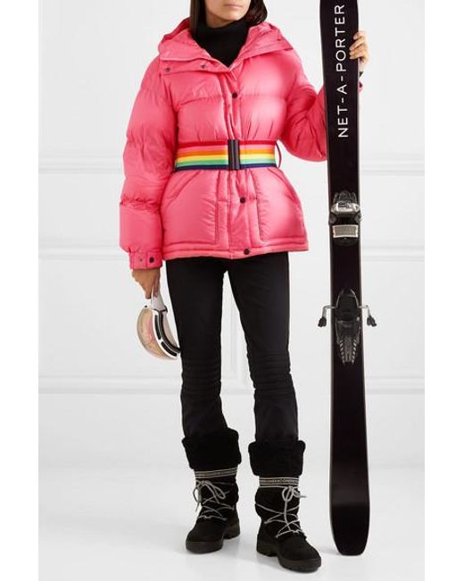 Designed to look just as cool on or off the slopes, Perfect Moment's jacket is made from water resistant pink quilted shell and comes with an elasticated rainbow belt that defines your waist. It's filled with insulating down and has a vibrant 'Nordic Green' lining with pockets for your ski goggles, phone and headphones. The generous hood and snap-fastening elasticated cuffs keep out the elements.