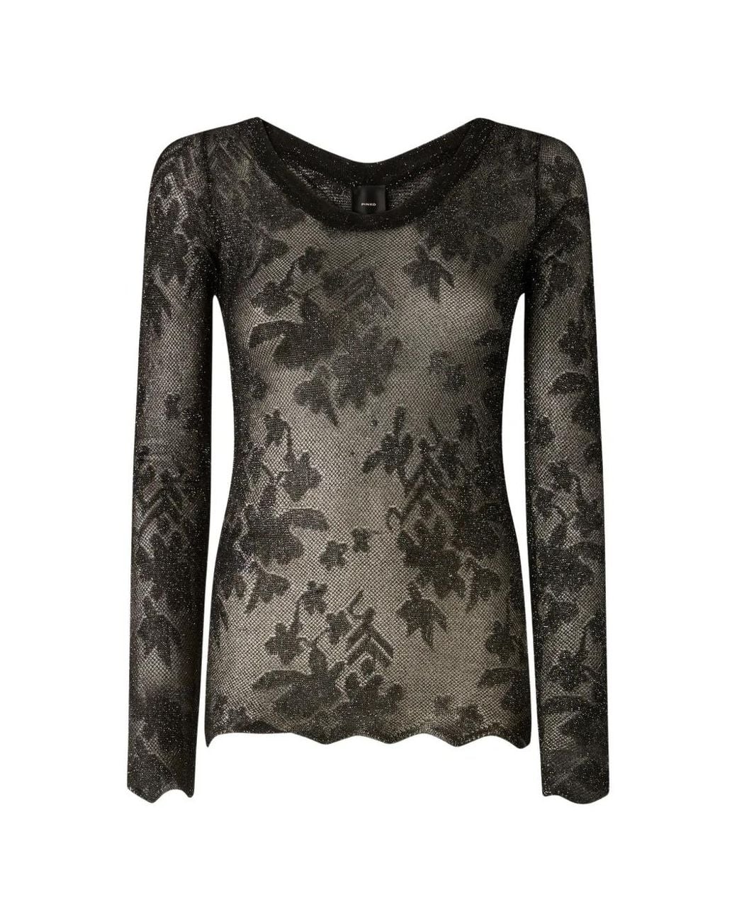 Black floral detail ruched long sleeves scalloped hem Size: M. Gender: Female. Material:Viscose/Metallic Fibre/Nylon. Color: black