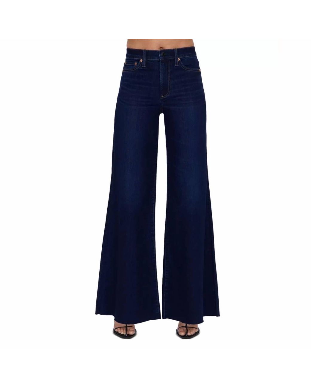 A flattering silhouette that's suprisingly versatile.These high-rise wide-leg jeans feature a utility design with a raw hem and a zip fly with button closure. The garment is constructed from 99% cotton and 1% spandex and includes four patch pockets located on the front and back. Color: blue