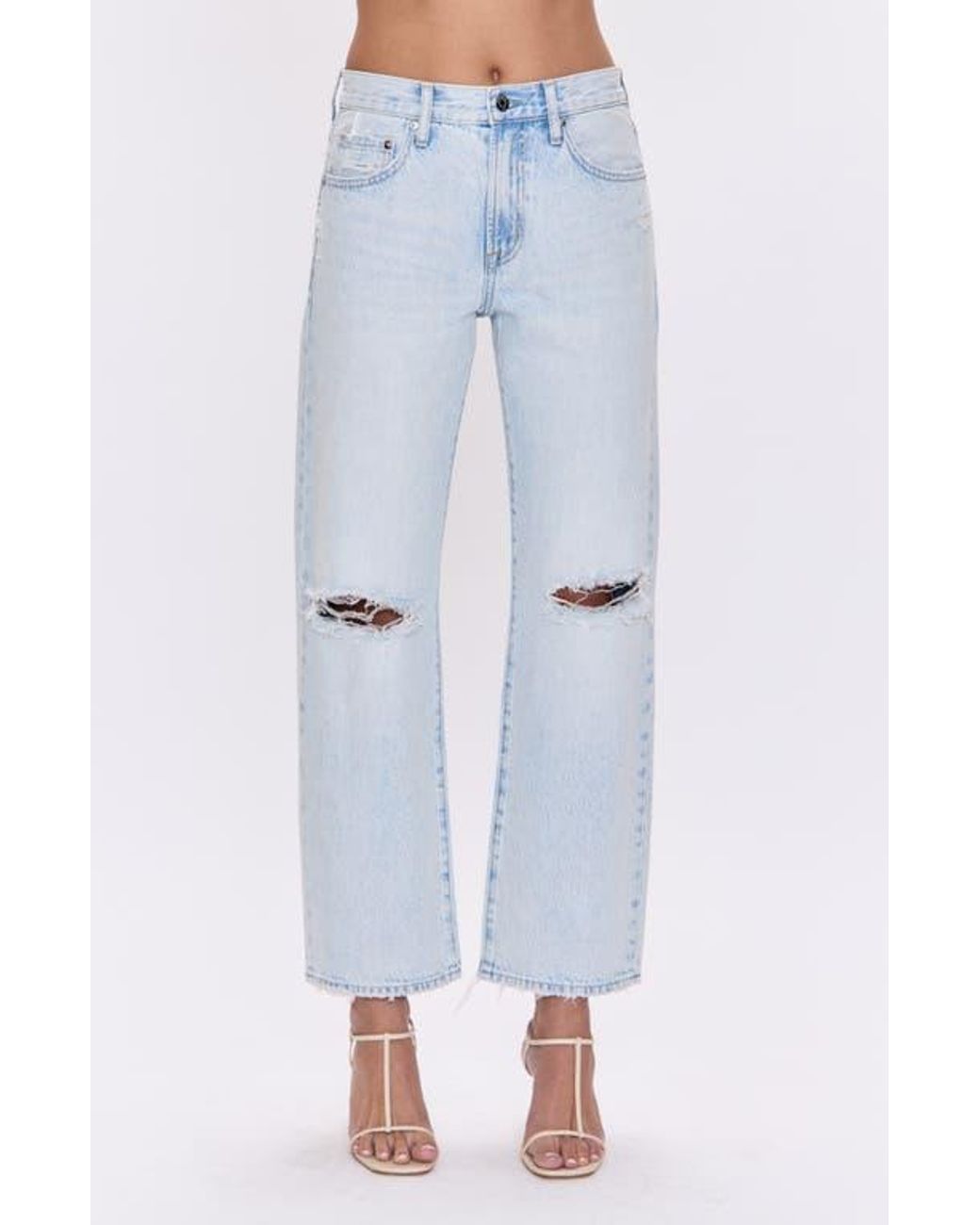 Sport a cool vintage-meets-modern look in straight-leg jeans crafted from nonstretch denim with a high waist and ankle-grazing hems. 26" inseam; 17" leg opening; 10" front rise Zip fly with button closure Five-pocket style 100% cotton Machine wash, dry flat Imported