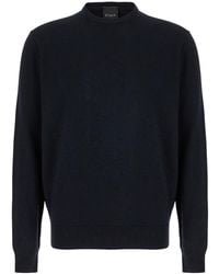 Go to Gaudenzi BoutiqueSweater Dark blue Ribbed crewneck Long sleeves Ribbed hem and cuffs Merino wool and silk blend Regular fit Composition: 75% Merinos Wool 15% Silk 10% Cashmere Color: blue