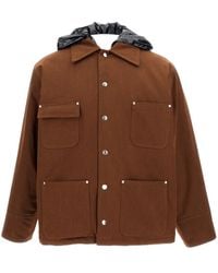 Go to ItalistNylon hooded jacket. Features large front pockets, a comfortable fit, padded interior, and snap button closure. Brown. Made in Italy. Composition: 54% Nylon, 46% Cotton Color: brown