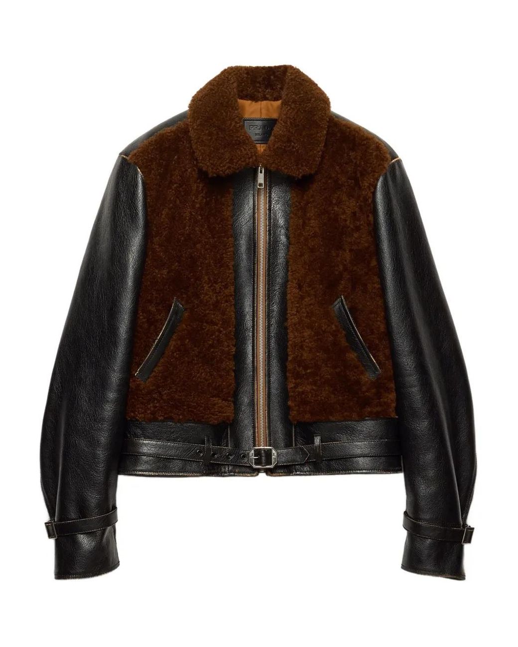 Black and brown shearling centre zip fastening shirt-style collar welt pockets buckled straps cuffs belted hem triangle logo back Size: 48. Gender: Male. Material:Lamb Shearling/Lamb Skin.
