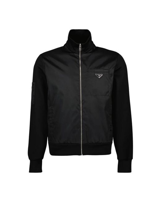 Prada Re-Nylon Jacket is a versatile zip-up layer that pairs a Re-Nylon front with a soft fleece body. Designed for everyday training and casual wear, it combines practical pockets with a high collar for added coverage. Key attributes: Black | Noir | Cotton | Lightweight | Fleece finish | Front zip closure | Chest pocket with hook-and-loop fastener | Side pockets | High collar | Long sleeves | Ribbed cuffs and hem | Straight cut | Enameled triangle logo | Dimensions & fit: Length: 66 cm (size M) | Composition & care: 70% cotton | 30% polyamide Color: black