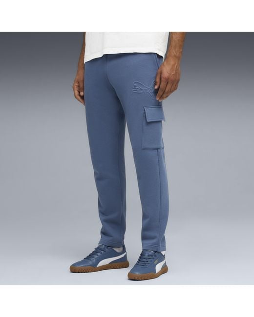 Stylish, comfy, and always on point â PUMA Essentials are made for laid-back days. Whether you're lounging, grabbing a coffee, or on the go, these pieces provide the perfect mix of comfort and style. Simple, versatile, and designed to keep you feeling great all day long. FEATURES & BENEFITS Made with at least 50% recycled materials Fit: RegularMain Material: FleeceLength: RegularRise: MediumPockets: Side Cargo PocketsRibbed waistband | PUMA Elevated Essentials Men's Cargo Pants in Blue, Size XXL Color: blue