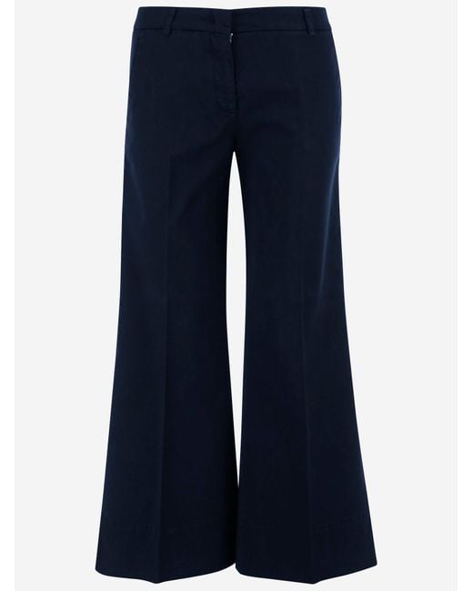 Pants made from stretch cotton Waistband with belt loops Two welt pockets at the back Pressed crease Flared leg Navy blue Made in Italy Composition: 97% cotton, 3% elastane