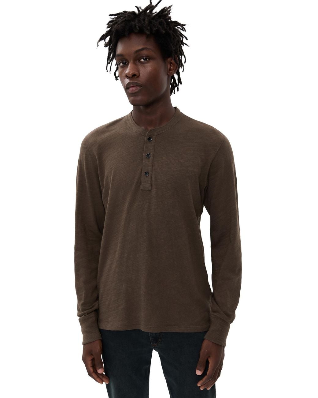 Fabric: Lightweight, super-stretch slubbed knit. Henley style. Long sleeves. Partial button placket. Shell: 100% cotton. Wash cold. Imported, Peru. Measurements: Measurements from size M Length: 26.75in / 68cm Sleeve: 35in / 89cm Chest: 41in / 104cm Color: brown