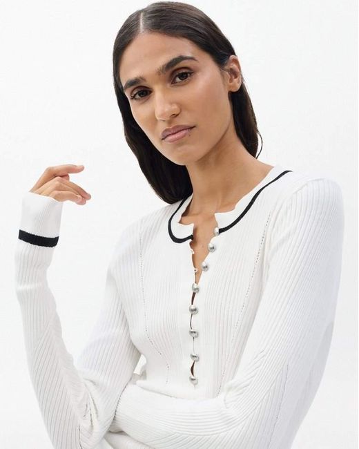 Closet essential. This long-sleeve henley shirt is cut for a close fit from a soft, ribbed jersey. Domed metal buttons and contrast trim add pops of detail that make it stand out. Pairs perfectly with your favorite denim for an effortlessly refined, everyday look. Ivory XXS Color: white