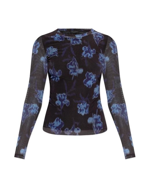 Rag & Bone Floral Motif Top is a fitted long-sleeve mesh top that pairs a semi-sheer, breathable fabric with an expressive blue floral motif on a black background—ideal for layered or refined casual looks. Key attributes: Black | Mesh | Lightweight | Breathable | Semi-sheer | Slightly rounded neckline | Long sleeves | Fitted silhouette | Blue floral motif on black background | Dimensions & fit: Model height: 177 cm | Model bust: 83 cm | Model waist: 61 cm | Model hips: 89 cm | Model is wearing size: S | Fitted cut | Composition & care: 90% polyester | 10% elastane | Machine wash cold on delicate; lay flat to dry. Color: blue
