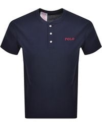 Go to MainlineRalph Lauren Henley Sleep Top T Shirt In Black. A ribbed rounded neckline with short sleeves and a three pearlescent button fastening at the neck. The signature Ralph Lauren Polo is embroidered on