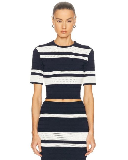 Ralph Lauren Collection Short Sleeve Top in Navy,White 83% viscose 17% nylon. Dry clean only. Pull-on styling. Ribbed trim. Cropped fit. Midweight knit fabric. RALF-WS21. 290P08722001. About the designer: Color: blue