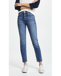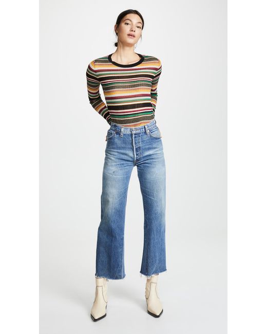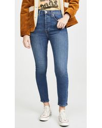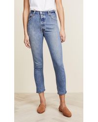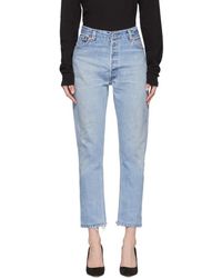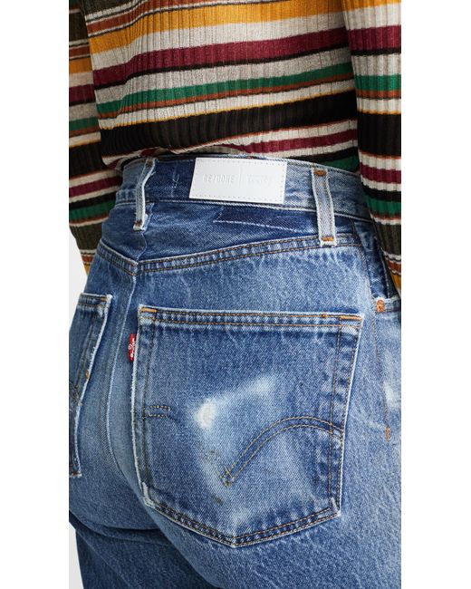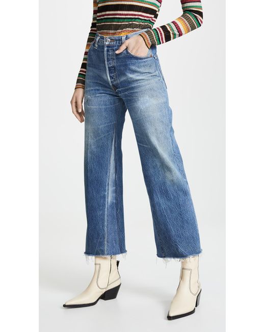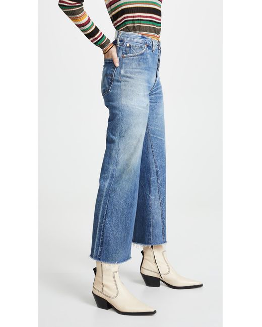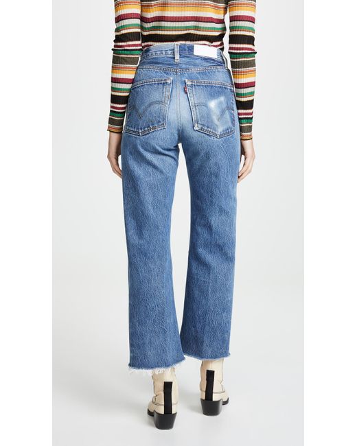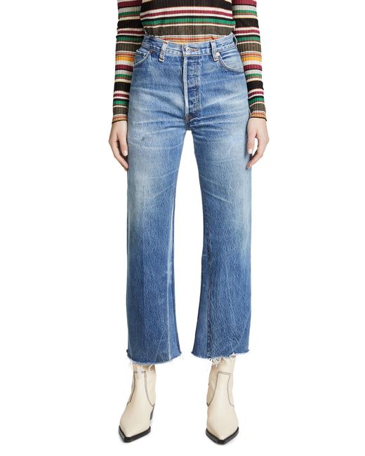 Fabric: Non-stretch denim. Interior inset panels. High-waist and raw hem. Distressed. Wide-leg cut. Ankle length. Hidden button at fly. Slant front pockets and patch back pockets. Shell: 100% cotton. Wash cold. Reconstructed from previously owned Levi's jeans, these are one-of-a-kind. Wash color may vary. Style #REDON30219. Rise: 11.5in / 29cm. Inseam: 27.5in / 70cm. Leg opening: 19.75in / 50cm. These authentically faded RE/DONE jeans have 'new favorite' written all over them! They're designed with a comfy high rise, and a cropped, wide-leg silhouette that's sure to sweep you off your feet. Color: blue