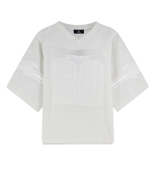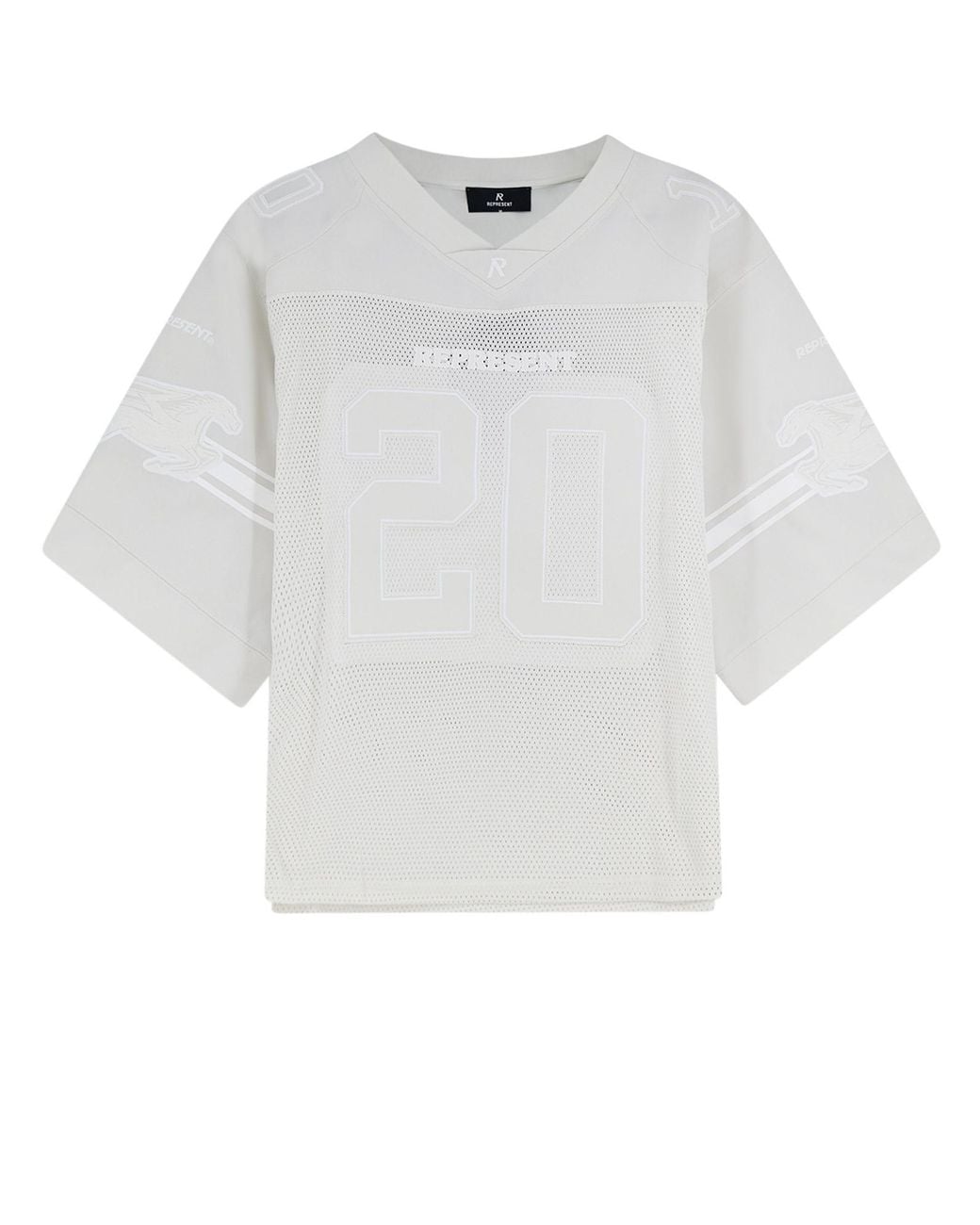 Short-sleeve football jersey-style top in off-whitechalk, constructed with a combination of solid fabric panels and perforated mesh panels. Features a V-neckline with a small embroidered R logo at the center, large embroidered number 20 on the front chest and 11 on the back, a tone-on-tone REPRESENT text patch on the upper back, and embroidered horse mascot graphics with stripe detailing on the sleeves. The back panel is partially solid fabric at the upper section and mesh at the lower section. All branding and graphics are executed in a tonal off-white colorway. Color: white