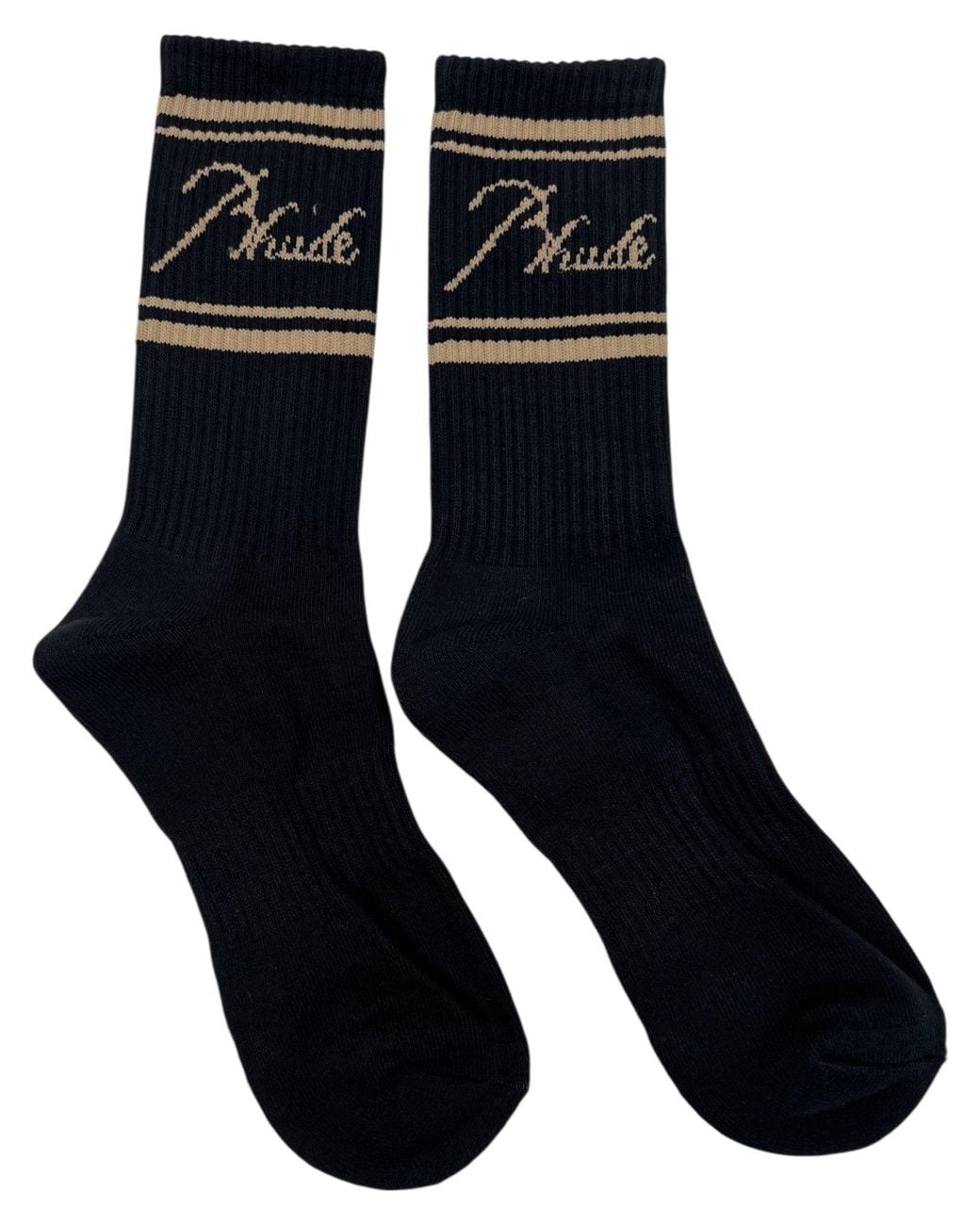 Rhude Script Logo Sock Black/Gold. . 80% Cotton 12% Polyester 8% Spandex. . Style RHPS26SO02750 Color: black