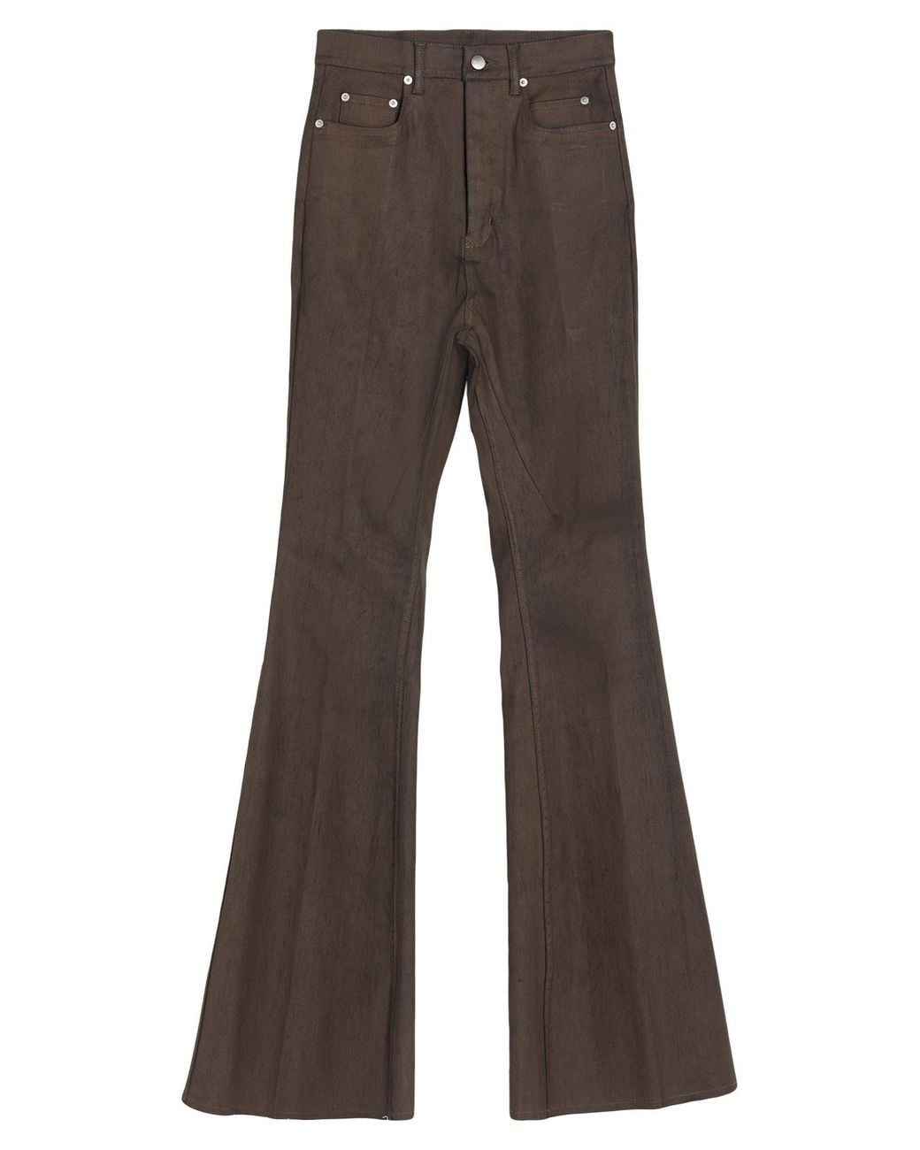 Flared jeans, denim, coated effect, solid color, no appliqués, colored wash, high waisted, slim fit, button fastenings, zipper fastening, slit pockets, welt pockets, do not wash, do not bleach, do not tumble dry, do not iron , Color: Light brown , Size: 25
