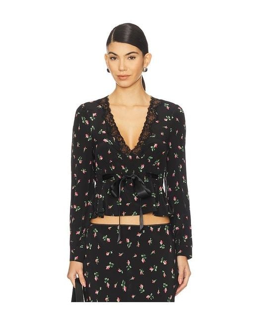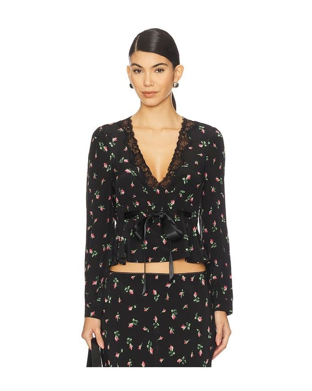 RIXO Charis Top in Black. - size L (also in S, XL) RIXO Charis Top in Black. - size L (also in S, XL) Self 1: 100% silk Self 2: 100% polyamide. Made in China. Dry clean. Pull on styling with attached satin self tie at front. Buttoned cuffs. Satin textile with lace trim. RIXR-WS7. 030.05487.425.06937. Color: black