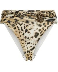 Go to Roberto CavalliTwo-piece bikini set with triangle top and briefs Halter neck and back tie closures for an adjustable fit Briefs feature adjustable side ties for personalized comfort Gold-tone metal tips on the ties add