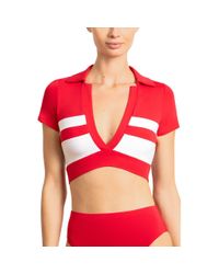 Go to Bloomingdale'sRobin Piccone Simone Short Sleeve Tankini Top.Color:Navy/Red.Size:S.Material:92% nylon/8% spandex; lining: 59% nylon/41% spandex.Swimsuits.