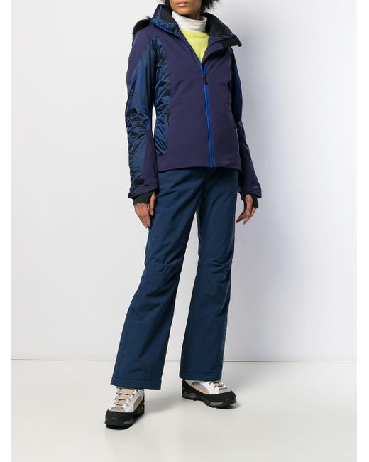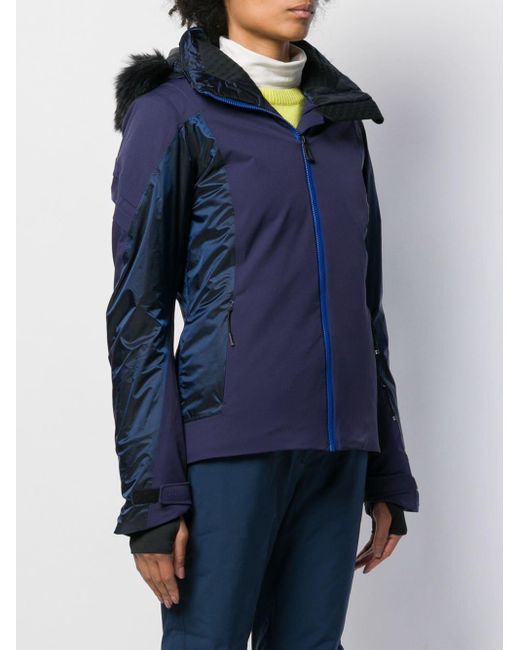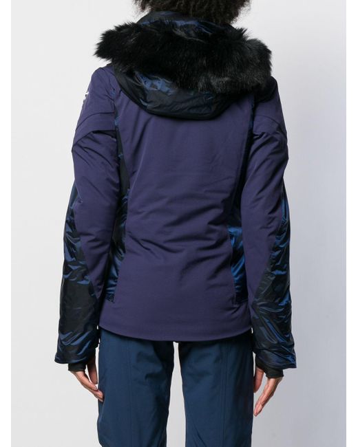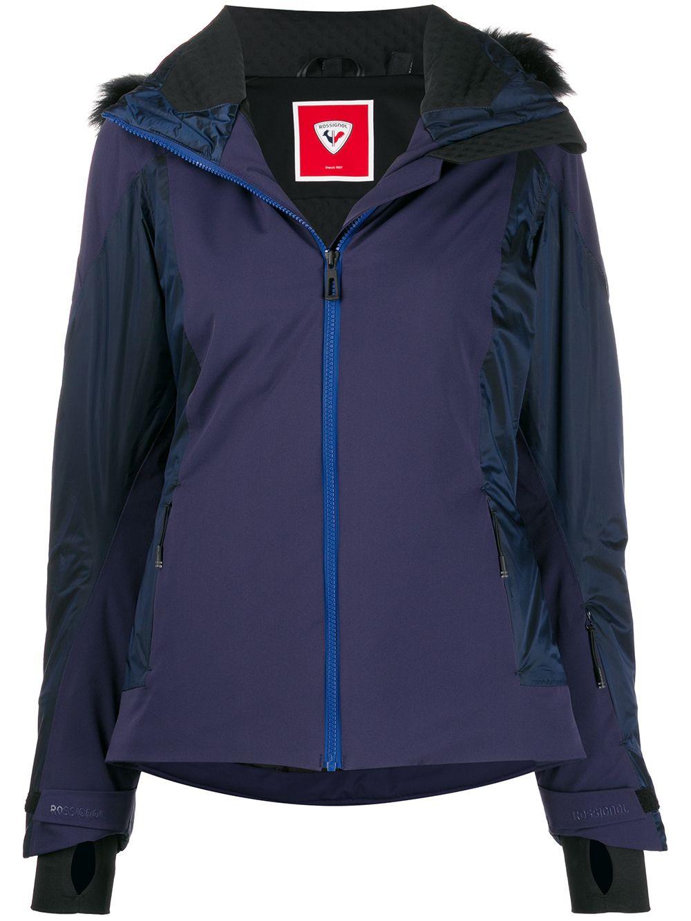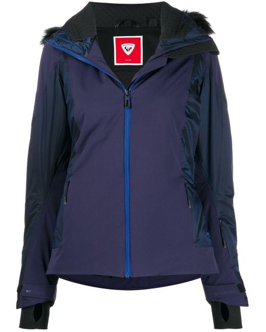 Multicolor Aile ski jacket from Rossignol featuring a faux-fur trimmed hood, a front zip fastening, long sleeves, a paneled color block design, zipped side pockets, a stretch fit, a fitted silhouette, a short length, a logo patch to the sleeve, thumb hole cuff detailing and touch strap cuffs. Material:Acrylic/Modacrylic/Nylon/Polyester/Spandex/Elastane. Color: blue