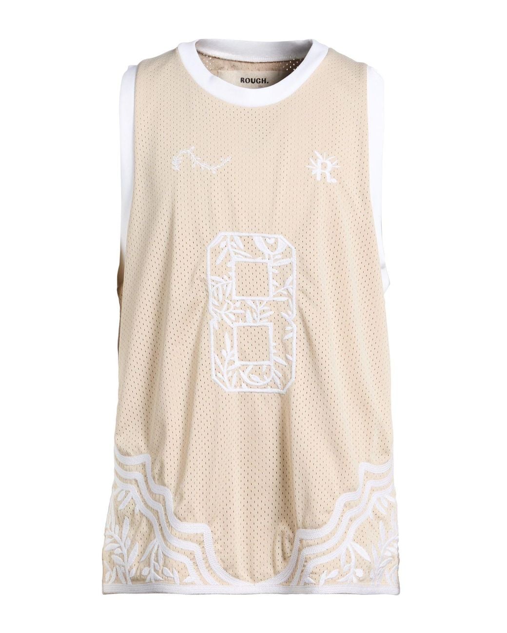 T-shirt, mesh, solid color with appliqués, embroidered, embroidered logo, knitted trims, crewneck, sleeveless, machine wash or dry clean, do not bleach, do not tumble dry , Color: Beige , Size: L