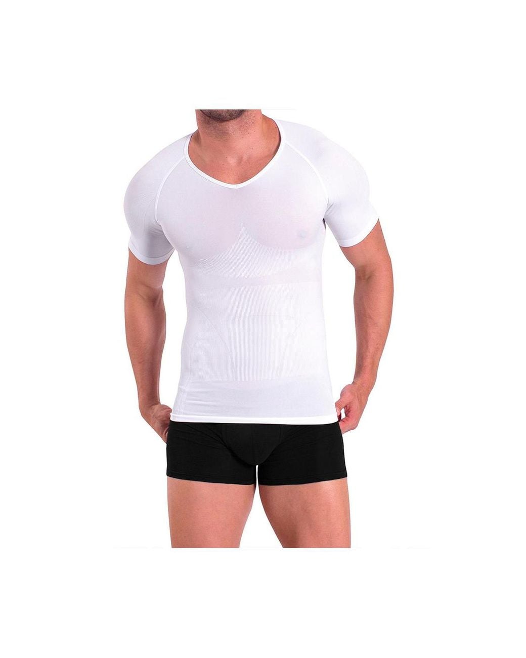 Introducing a thinner, breathable, lightweight seamless compression shirt that slims the abs and tones the upper body. Featuring our patented physiotherapy inspired design that pulls back the shoulders and straightens the back. 93% Premium Cotton/7% Elastane. Color: white