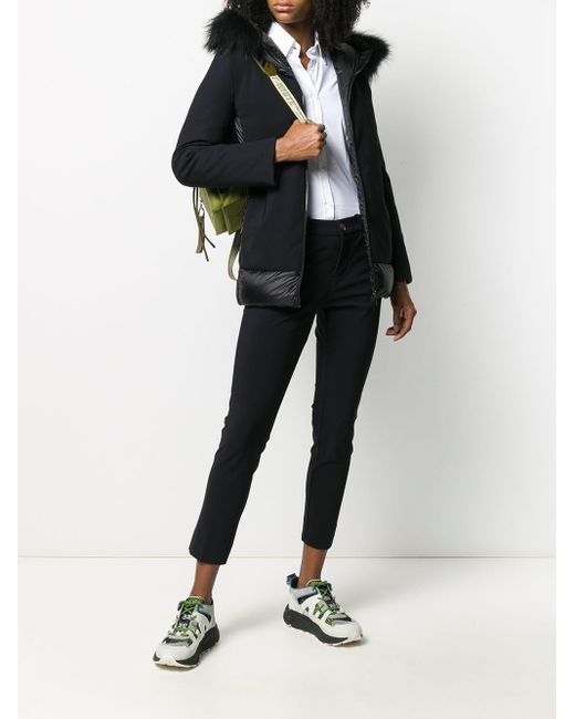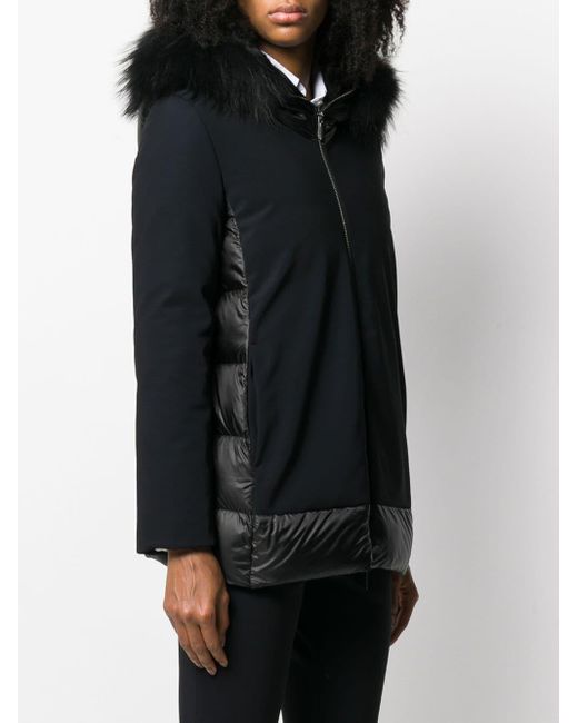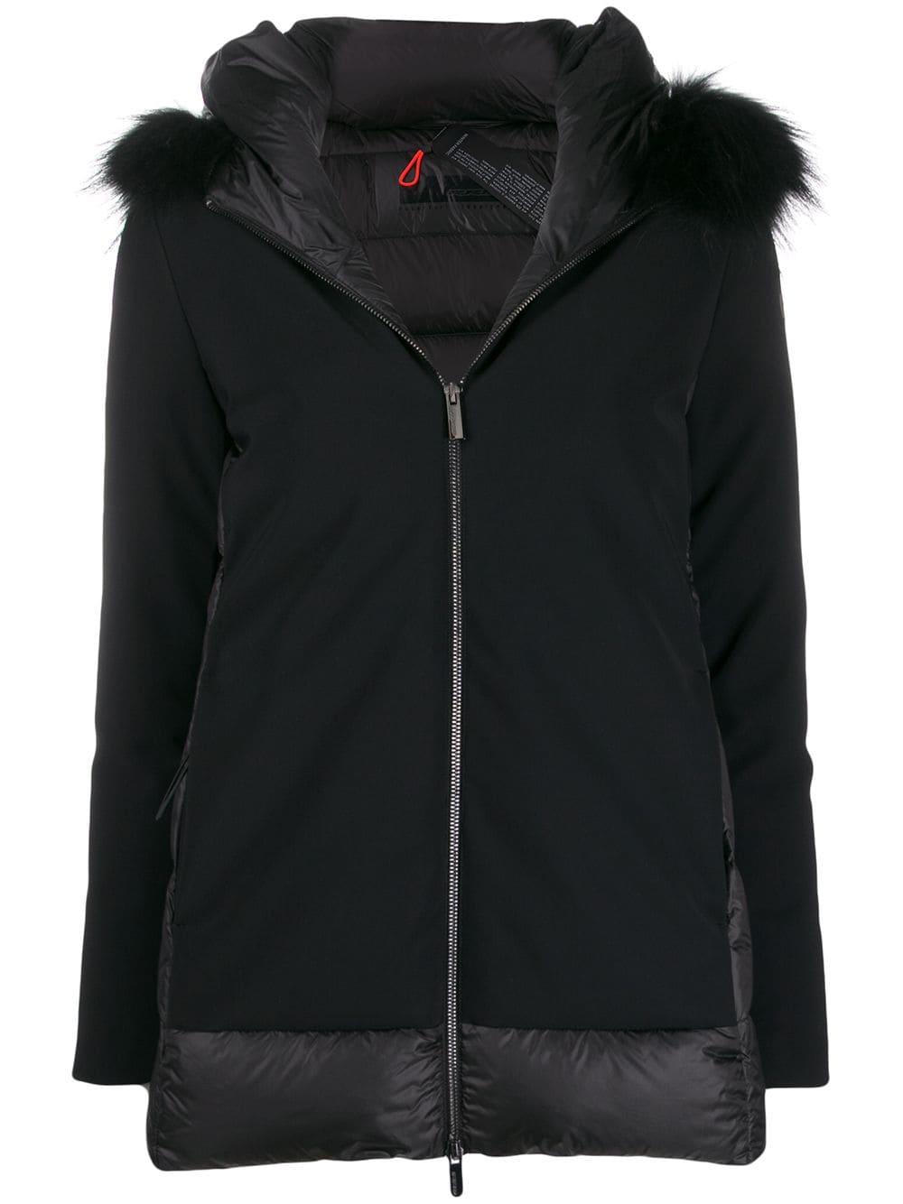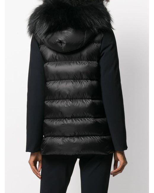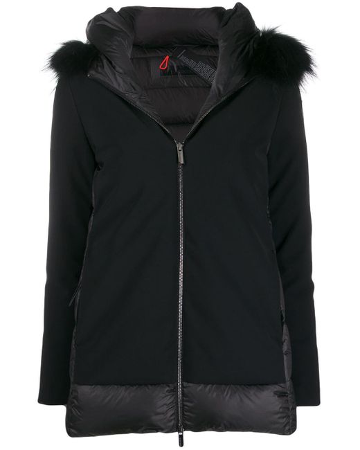 Black nylon blend Hybrid Zar contrast padded jacket from RRD featuring a faux-fur trimmed hood, a front zip fastening, side pockets, long sleeves, contrasting panels and a padded interior. Material:Feather Down/Polyamide/Polyamide/Spandex/Elastane. This item may not be on sale in France, UK, Italy, Belgium and Switzerland. Color: black