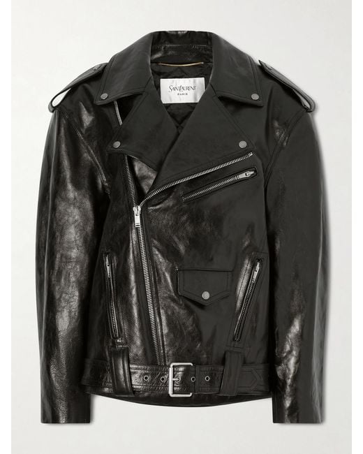 - Glossed Textured-Leather Biker Jacket